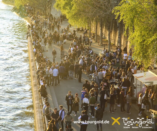 Im Sommer ist der schönste Ort in Paris das Ufer der Seine. Vor allem im Zentrum rund um die Île de la Cité, aber auch in der Nähe des Eiffelturms habt ihr zahlreiche Möglichkeiten am Wasser zu sitzen und die Sonne zu genießen. An manchen Stellen gibt es auch Buden oder ganze Cafés, die euch mit Kaltgetränken, Kaffee, Wein, Bier oder Cocktails versorgen.